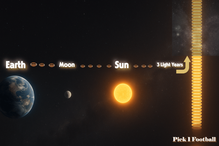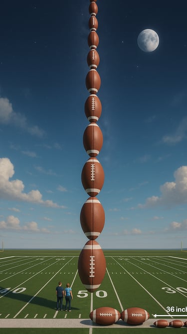 “Picture 10¹⁷ footballs stacked tip-to-tip. With each football about 0.3056 yards long, the tower would be 30.56 quadrillion yards high. A 100-yard football-tower is only about 327 footballs; you’d need 305.6 trillion of those 100-yard towers end-to-end to match the stack.
